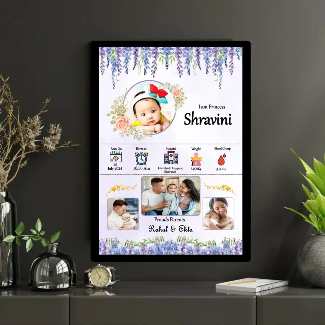 1. Personalized Details:  Most usually, the frame is going to have distinct information that includes details like name, date of birth, time and place of birth, weight, height, and sometimes even the names of the parents.